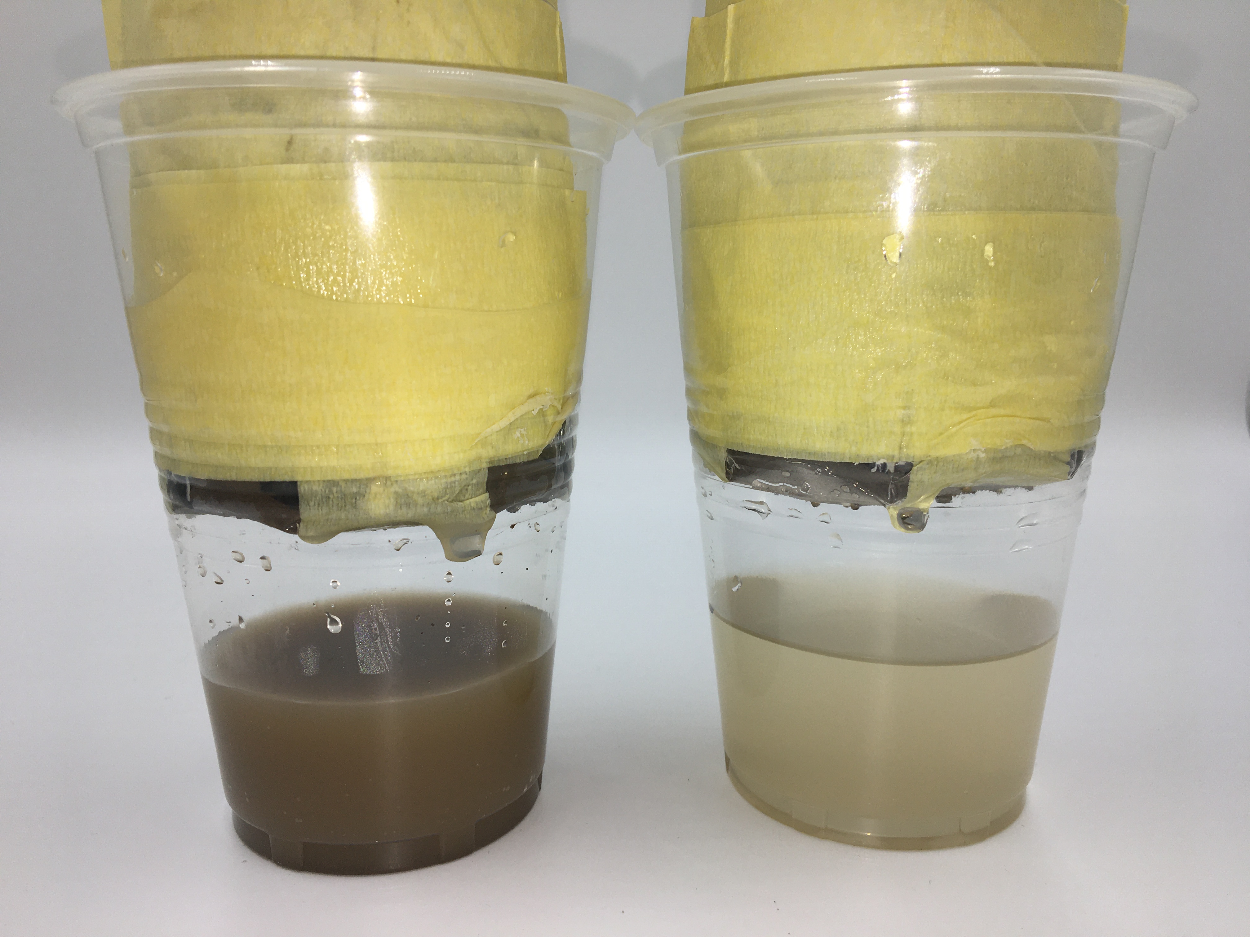 Fig 3. Turbidity of leachate from control (LHS) and Entra-treated column (RHS) following 3 rainfall simulations.